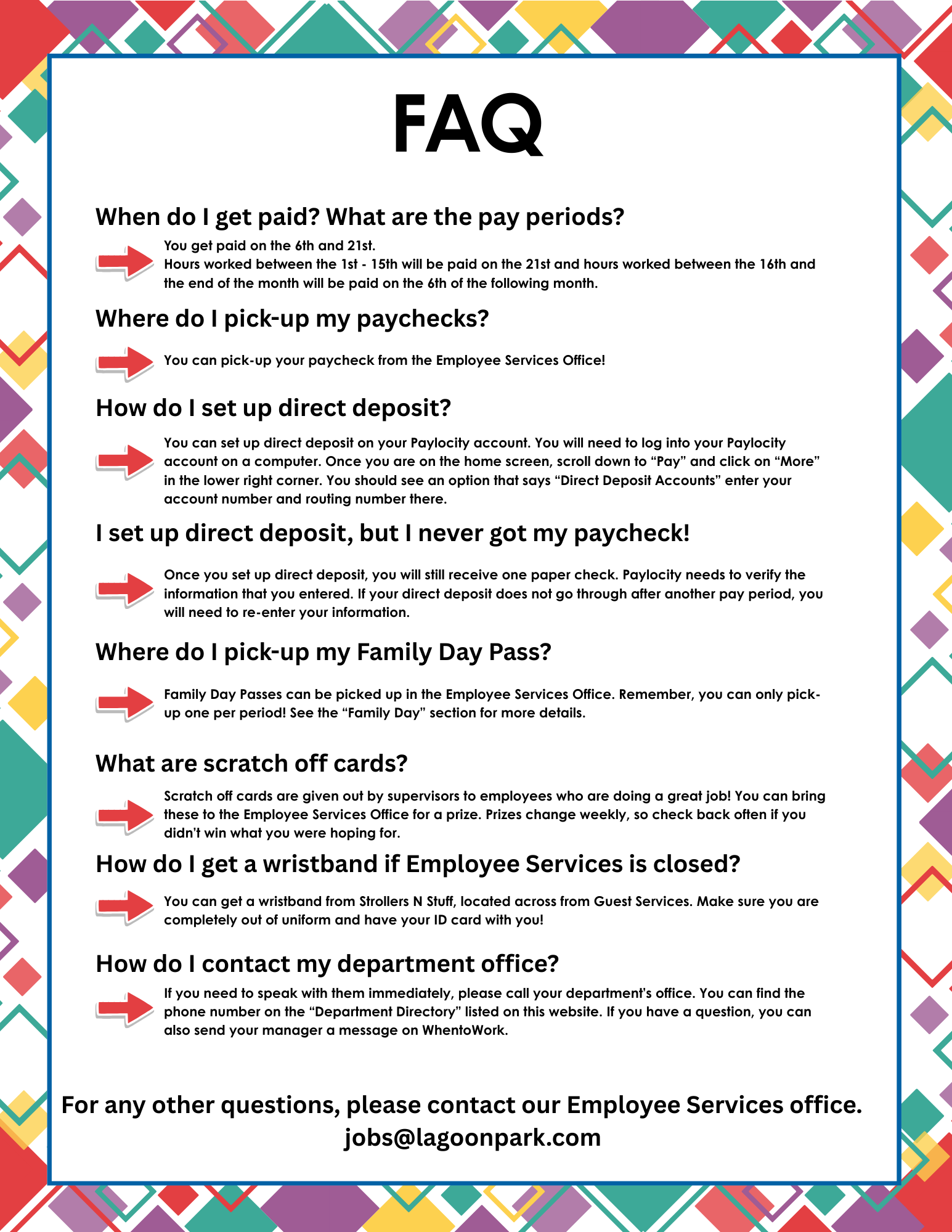 One of the great benefits of working at Lagoon is the opportunity to bring your family to Lagoon for a discount. Your family may choose ONE day from each of the Employee Family Day periods to visit Lagoon. All Single Day Passports, for each family member must be purchased in one transaction. NO EXCEPTIONS. The Employee Family Day coupon, as well as one Complimentary Parking Ticket, will be distributed from the Employee Services Office beginning one week prior to the scheduled Employee Family Days.